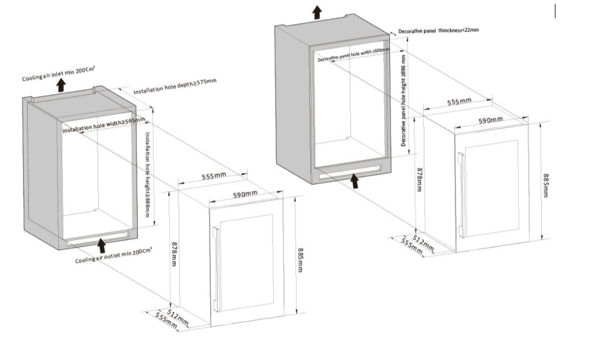 - При установке с помощью ножек отрегулируйте винный шкаф по уровню и убедитесь в наличии необходимых зазоров между дверью и мебельными фасадами, чтобы не повредить их.